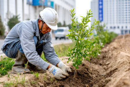 Man in hard hat and gloves planting a tree sapling in soil for a new forest