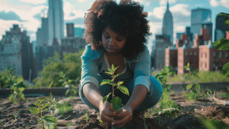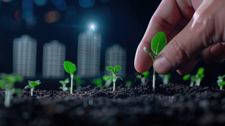 A close-up view of a hand carefully planting a seedling in rich dark soil, with a blurred urban skyline in the background symbolizing potential and sustainability.