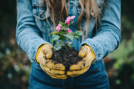 A person gently holds a potted plant, showcasing vibrant flowers emerging from rich soil, highlighting a connection with nature and gardening.