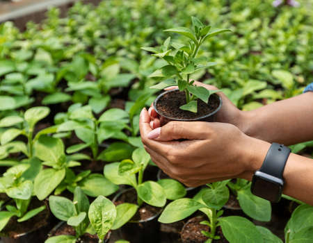 Young man transplanted small seedlings into mineral rich potting soil and prepared to water the plants, Plants help increase oxygen in the air and soil, Loving the Earth and Conserving the Environment