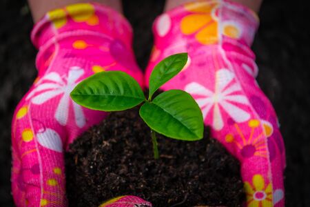 Female hands in pink gloves hold pomelo sprout Young plant pomelo in the soil of humus on the background of black soil
