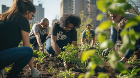 Focused volunteers collaborated to cultivate lush plants in an urban community garden setting.