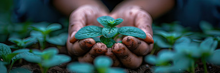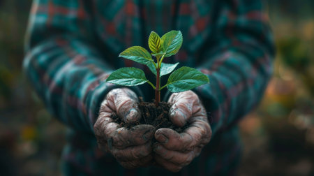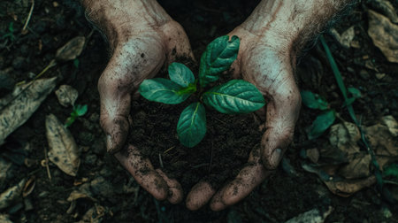 A pair of hands cradles a young plant emerging from rich soil, symbolizing growth and sustainability in nature. Perfect for eco-friendly themes.