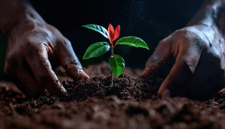 A close-up of hands planting a vibrant sapling in rich, dark soil