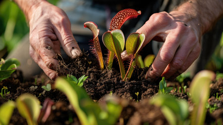 Hands planting a vibrant carnivorous plant in rich soil, garden care