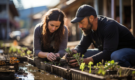 Environmental volunteers engaged in gardening work generative by Ai.