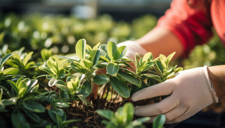 Experienced gardener carefully pruning lush green plants with gloved hands on a sunny and bright day