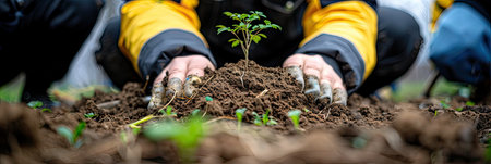 hands plant plants, local food production. trees in the ground close up. Concept of Save World, Earth day and Community Engagement, ultra wide format, by ai generative