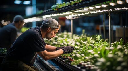 An AI generated illustration of a man taking care of plants in plastic cups in a greenhouse