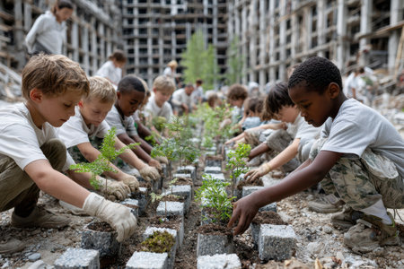 Children work together to plant young trees in an abandoned construction site during community service.