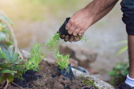 Young man transplanted small seedlings into mineral rich potting soil and prepared to water the plants, Plants help increase oxygen in the air and soil, Loving the Earth and Conserving the Environment