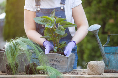 Woman gardener transplanting flowers in pot. Concept of home garden, spring activities..
