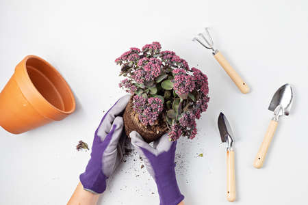 Potted plant in a transplant and care on a white background