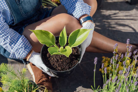 Stylish young woman-gardener holding a plant before planting in garden. Top view.