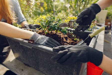 young woman planting in soil. young people planting in soil.
