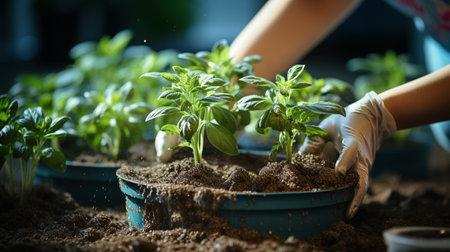 Top view of hands holding flower to plant with gardening tools. Generative AI