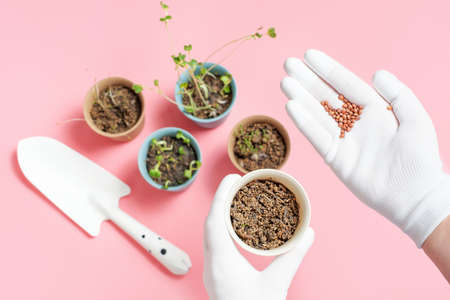 Female hands in white gloves holds seeds against the background of seedlings and soil in a pot.