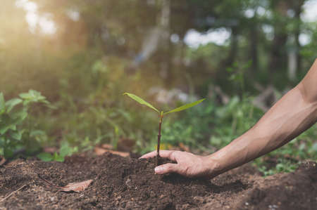 World environment day reforesting, Hands of young man were planting the seedlings and tree growing into soil while working in the garden as save the world, earth day, nature and ecology concept.