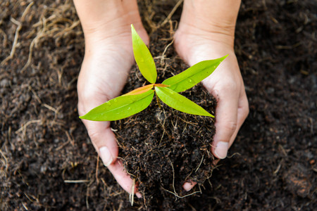 A small tree and hands are planting trees tenderly.