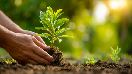 Close-up of hands carefully placing a sapling into rich earth under bright sunlight, symbolizing growth, eco-consciousness, and hope for a sustainable