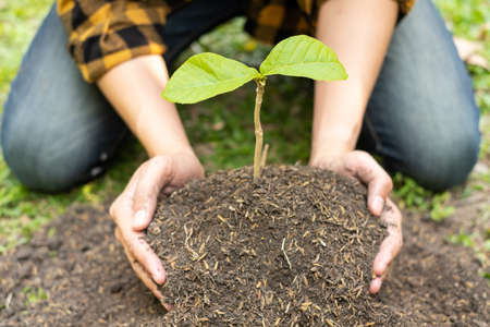 ecological concept nature background Detail of a young man's hand holding a green sapling growing from the soil environment, forest conservation concept.