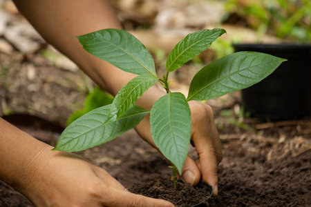 Planting a tree, Hands of young man were planting the seedlings and tree growing into soil while working in the garden as save the world, earth day, nature, environment and ecology concept.