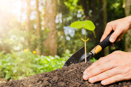 gardening work, planting a tree with gardening tools, caring for the environment, day time