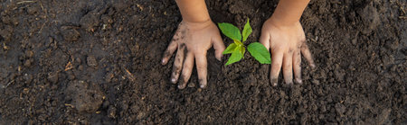 The child is planting a plant in the garden. Selective focus. Nature.