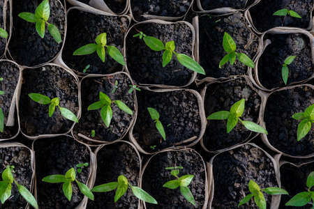 Growing pepper seedlings. Small sprouts of pepper seedlings growing in a greenhouse, February, March. Top view, flat lay, close-up