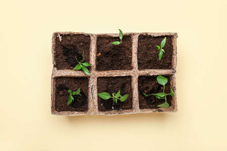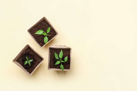 Peat pots with soil and green seedling on color background