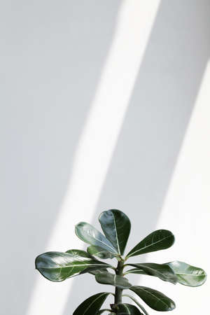 green leaves adenium on white background with sunlight. Creative nature background. minimalism concept selective focus copy space