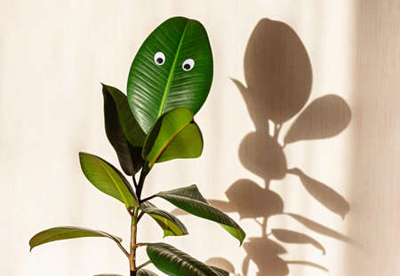 Ficus elastic plant, rubber tree on a background of a light wall. Googly eyes on the leaves. Shadows on the wall. Close up.
