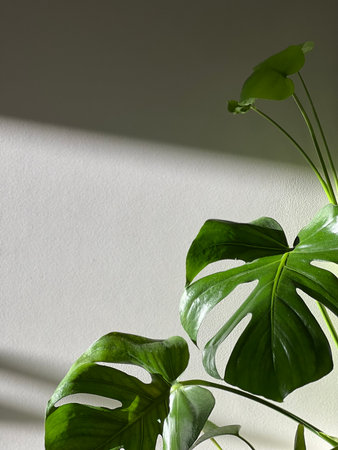 Beautiful monstera deliciosa or Swiss cheese plant in the sun against the background of a white wall. Home gardening concept. Selective focus.