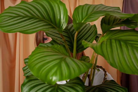 Woman looks through the leaves of the Calathea orbifolia tropical plant.
