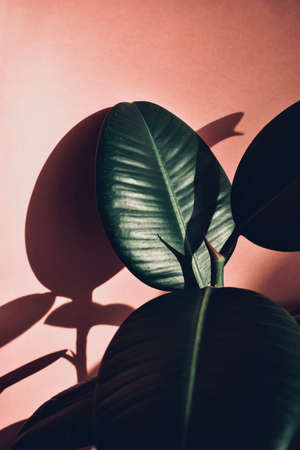Ficus leaves on a pink background. Trendy concept background.