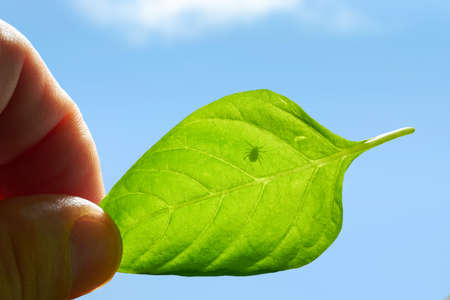 Dangerous insect on human skin. Mite hid on the leaf of the plant, encyphalitis mite. tick protection concept
