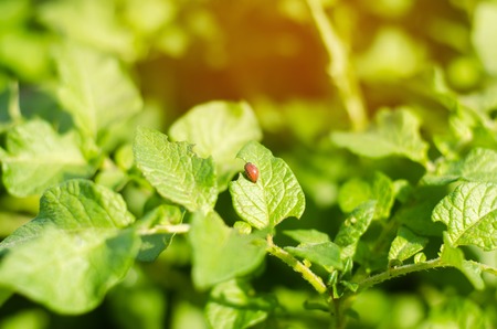 The larva of the Colorado potato beetle eats potato leaves. Vegetable garden, agriculture, rural, business
