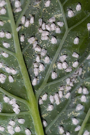 Leaf aphid on a green leaf. Small insect parasitizing on plants. Green leaf of cabbage damaged by aphids. Pest control in the garden.