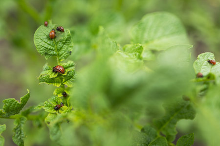 The Colorado potato beetles (Leptinotarsa decemlineata) on a close-up of potatoes. insect pests, farmer's enemy, damage to the crop, threat of crop destruction