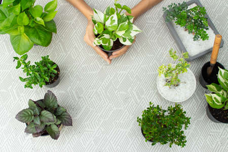 fashionable exotic plants, top view. Indoor plants, green area . Tropical background