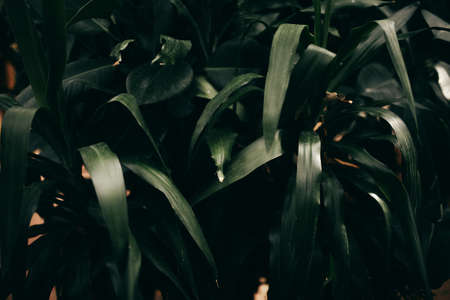 Selective focus on dark green leaves in the garden. Emerald green leaf texture. Nature abstract background. Tropical forest. Above view of dark green leaves with natural pattern. Tropical plant.