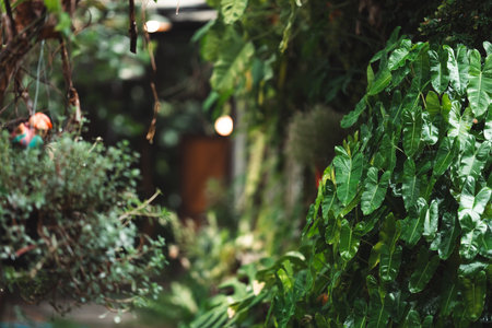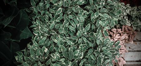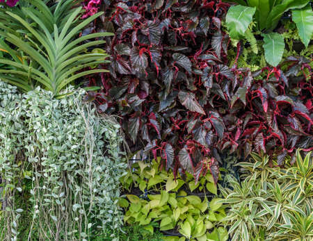 Tropical trees arranged in full background Or full wall There are leaves in different sizes, different colors, various sizes, many varieties. Another garden layout.as summer background with copy space
