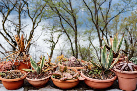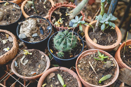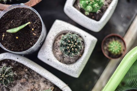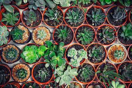 Variety of cactus and succulent growth in pot on wooden shelf in shop. Small plant for home or office.