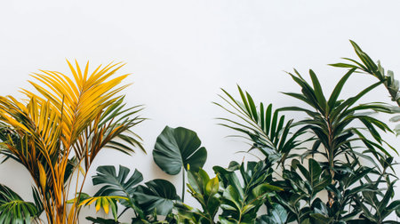 Tropical indoor plants creating a vibrant green and yellow botanical composition against a clean white wall