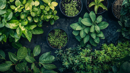 Top view of various green plants in pots arranged on a dark soil background, showcasing a rich and lush display of indoor greenery, perfect for garden and nature themes.