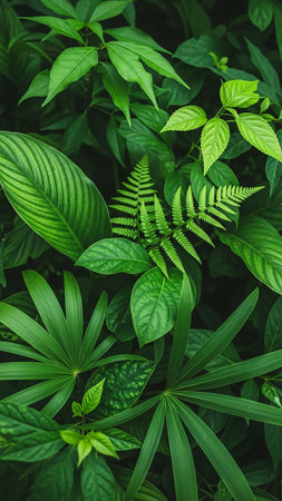 A dense canopy of various lush green tropical leaves and ferns with intricate veining and diverse shapes, creating a verdant jungle backdrop.