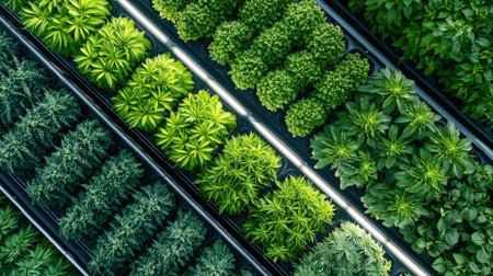 A top-down view of a microgreen farm with multiple rows of trays filled with various types of microgreens.
