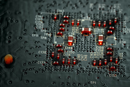 Bokeh electronic circuit close up computer in red colors