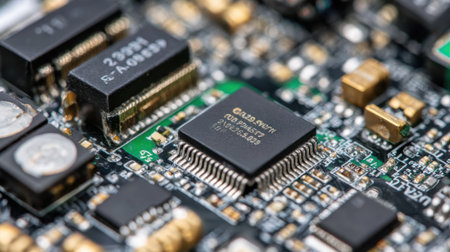 This high-resolution image features a close-up view of a complex circuit board showcasing various microchips and electronic components, perfect for technology-themed projects.