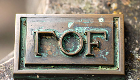 A close-up reveals the rich texture of an old, weathered metal plaque. The initials 'POF' stand out, surrounded by a beautiful green patina and verdigris, hinting at a long history and a story untold.